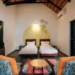 Discover The Meadow Farmhouse, a serene escape nestled in the scenic outskirts of KGF, Bangalore. This unique stay features a curated collection of luxurious cottages and tents, offering comfort surrounded by nature. With lush landscapes, a refreshing pool, and a dedicated playground for games like volleyball and badminton, it’s the perfect getaway for friends, families, and nature lovers. Whether you’re relaxing in a cozy bed or enjoying outdoor fun, this farm stay near Bangalore blends rustic charm with modern comforts.
